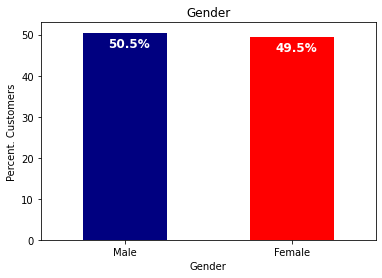 さて、研究の興味に応じて、matplotlib.ticker ライブラリを用いて、データセットの様々な変数をプロットすることができます。デモの目的のために、データセットのgender変数をプロットして、男性と女性の顧客のパーセンテージを見たいと思います。これは次のコードで実現できます。