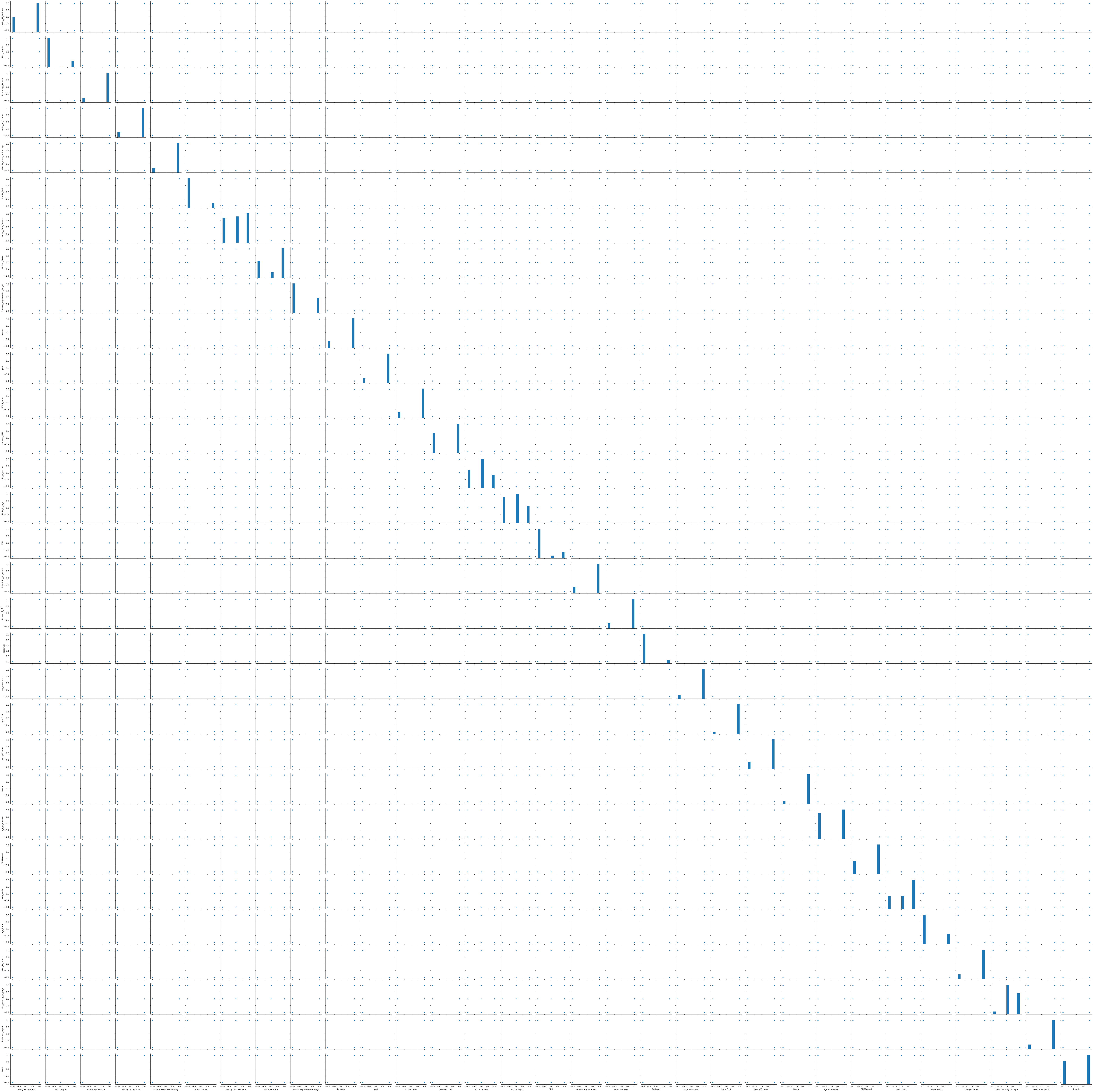 having_IP_Address URL_Length Shortining_Service having_At_Symbol double_slash_redirecting Prefix_Suffix having_Sub_Domain SSLfinal_State Domain_registeration_length Favicon popUpWidnow Iframe age_of_domain DNSRecord web_traffic Page_Rank Google_Index Links_pointing_to_page Statistical_report Result