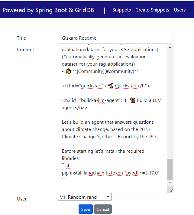 HTMLフォームを使用して新しいスニペットを作成します。 th:action 式は、フォームを /snippets/save エンドポイントに POST するように指示します。 th:object=「${snippet}」 は、フォームデータを収集するために使用するモデルオブジェクトを宣言します。