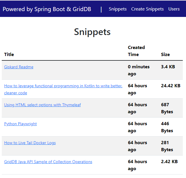 スニペットのリストを表示し、ヘッダーとボディセクションを持つ基本的なHTMLテーブル構造を定義します。ボディ内では、Thymeleafループ(th:each)を使用して、スニペットのリストを繰り返し処理します。最初の列には、スニペットの詳細へのハイパーリンクを作成するために、アンカー要素内にスニペットのタイトルが表示されます。