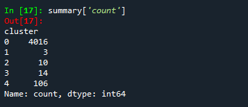 summary['count'] = clustering_data['cluster'].value_counts()
