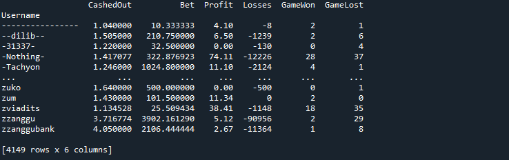 次に、「ユーザー名」を使ってデータをグループ化し、Bustabitでのギャンブル履歴を通じて、各ユーザーの収益、勝ち、負けを特定します。これにより、各ユーザーのギャンブル習慣を特定し、プレイヤーグループ間の関係や類似性をより理解することができます。