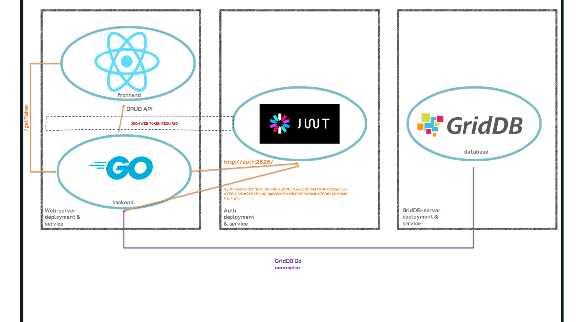 仕組みとしては、3つのkubernetes podsを作成し、それぞれがdockerコンテナ(Web-server、認証、GridDB)に対応します。これらのポッドと一緒に、各ポッドはネットワーキングを担当する独自のサービスを取得します。Podはすべて互いに依存しており、安全な方法で通信する必要があるため、ネットワーキングのルールを指示する独自のサービスが必要になります。これについては後で詳しく説明します。最後に、マシンのシャットダウンなどでもデータが持続するように、永続ストレージを作成します。