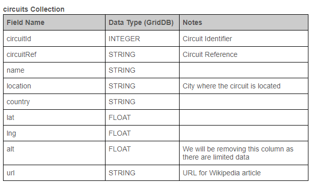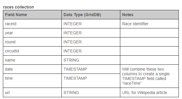 このデータセットには複数のCSVファイルが含まれており、この記事の例ではそこにあるcircuit.csvとraces.csvファイルを使用します。次の表は、各テーブルの基本構造と、データを変換するために予定されている変更点を表示しています。データタイプとは、GridDBの対象データタイプを指します。