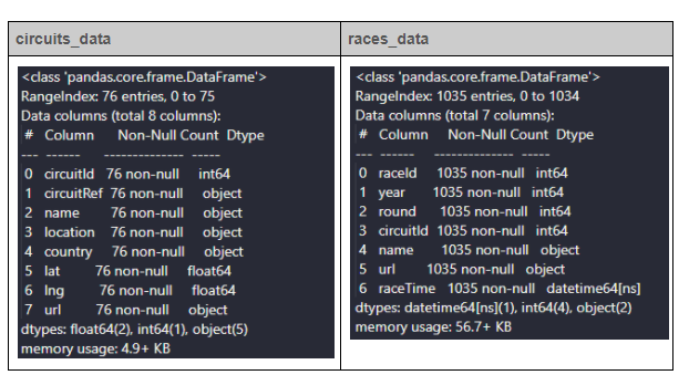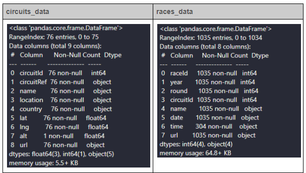 上記のコードでは、CSVファイルごとに1つとして2つのデータフレームを作成し、データフレームを反復してCSVファイルから抽出された構造化データセットを識別します。データセット(circuitIdとraceId)の中には既にインデックスが使用されているため、インデックスオプションはFalseに設定されています。データフレームは、データを管理・変換するためのゲートウェイです。