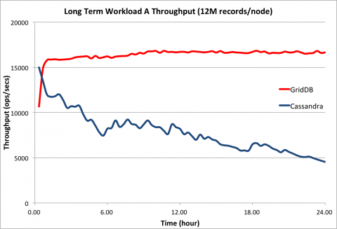 Fixstars は、8 ノードのクラスタを構成し、ノードあたり 4M と 12M のレコードをロードし、operationcount を 2^32-1 に設定し、24 時間にわたってテストを実行しました。その結果どちらのテストにおいても、Cassandra の 24 時間目のスループットは、最初の 1 時間目の 50% 以下でした。一方、GridDB のパフォーマンスは、インメモリ操作の実行中とメモリー外操作の実行中の両方において安定していました。