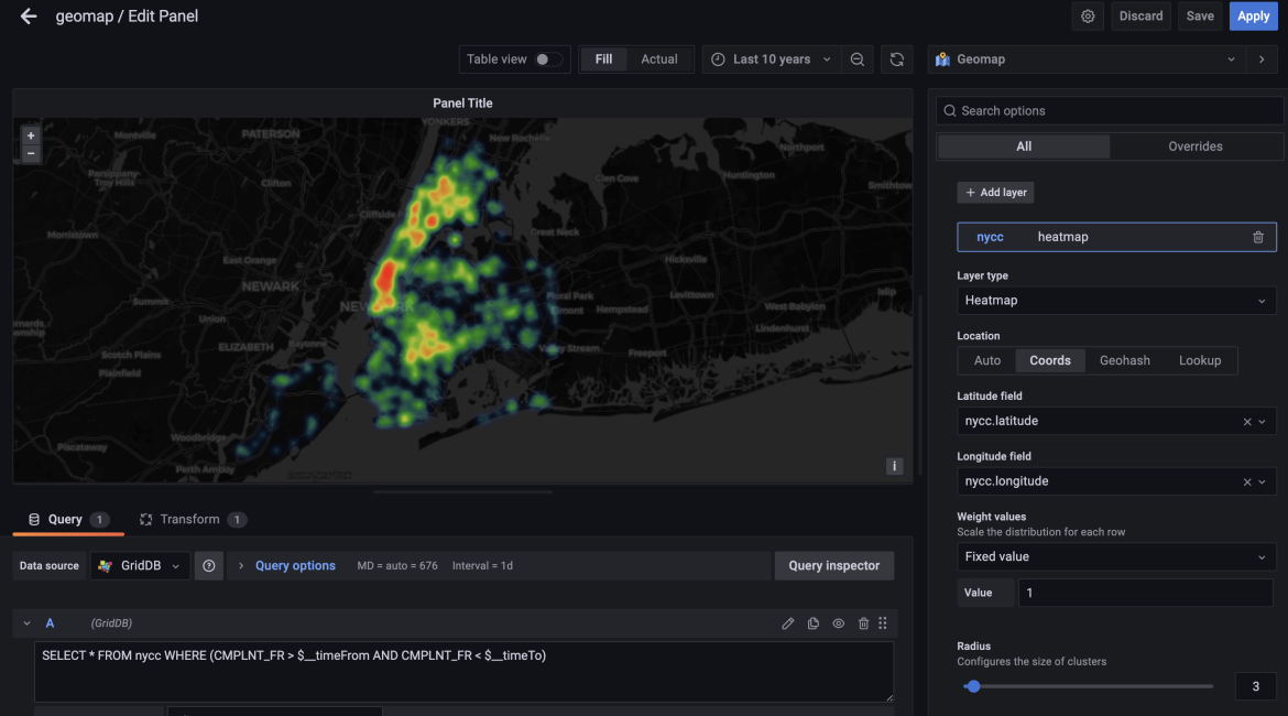 For this blog, we will use the same dataset to draw a heatmap of the crime complaints using GridDB and Grafana. When completed, we hope to have a nice graphic of an explicit heatmap overlaid on top of a map of NYC, showing the various complaints with an indication of frequency.