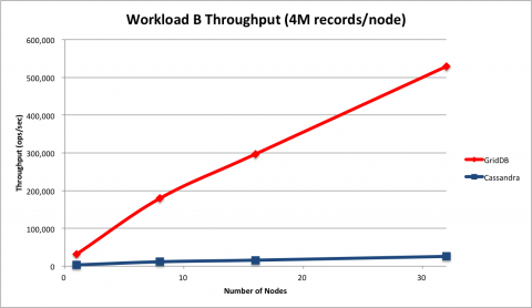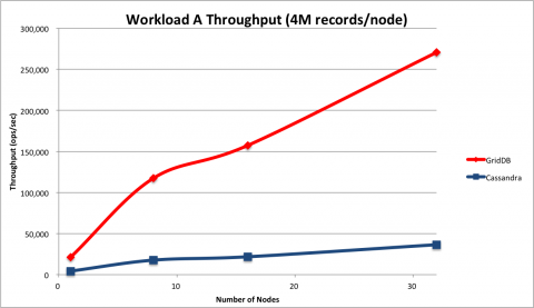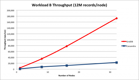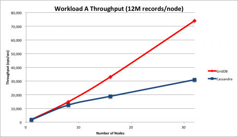 Fixstars は最近、Cassandra と GridDB の比較のため、Microsoft Azure 上で 1,8,16,32 ノードのクラスタと同じ数の YCSB クライアントを使い、インメモリーデータセット(ノードあたり 4M レコード)とメモリーに乗り切らないデータセット(ノード当たり 12M レコード)を使ったベンチマークを実行しました。