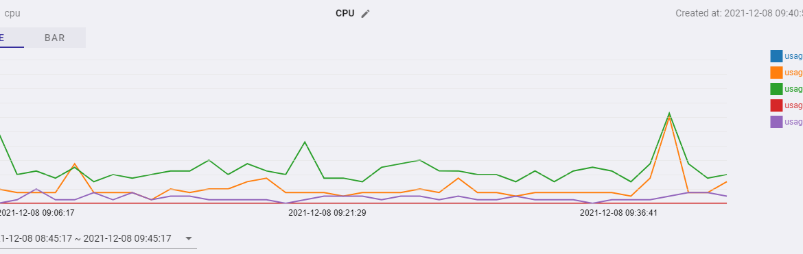 下の画像は、ホストマシンから送られてくるCPUのデータをグラフ化したものです。このデータは、単純な7zのCPUベンチマークを実行して得られたものです。もちろん、これは非常に単純な例ですが、他の開発者のみなさんはどのような形のメトリクスを得られるのでしょうか。